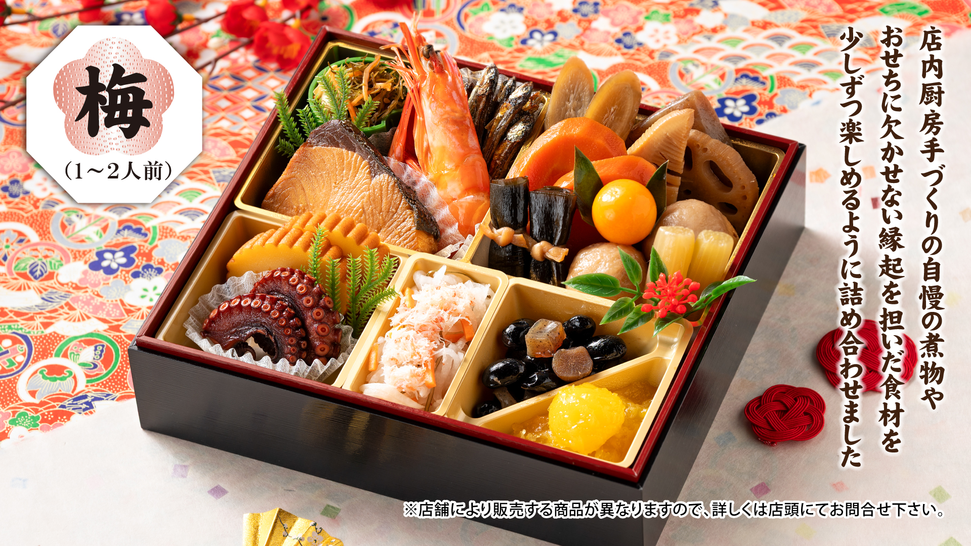 ぶりの煮付け・有頭海老のうま煮・たこのうま煮・昆布巻・筍煮・牛蒡煮・栗きんとん・丹波黒の黒豆しょうゆ煮・人参煮・蓮根煮・生芋こんにゃく・里芋煮・ふきのうま煮・椎茸煮・金柑・真だらのうま煮・伊達巻・田作り・カニ入り紅白なます・するめ寒干松前漬け