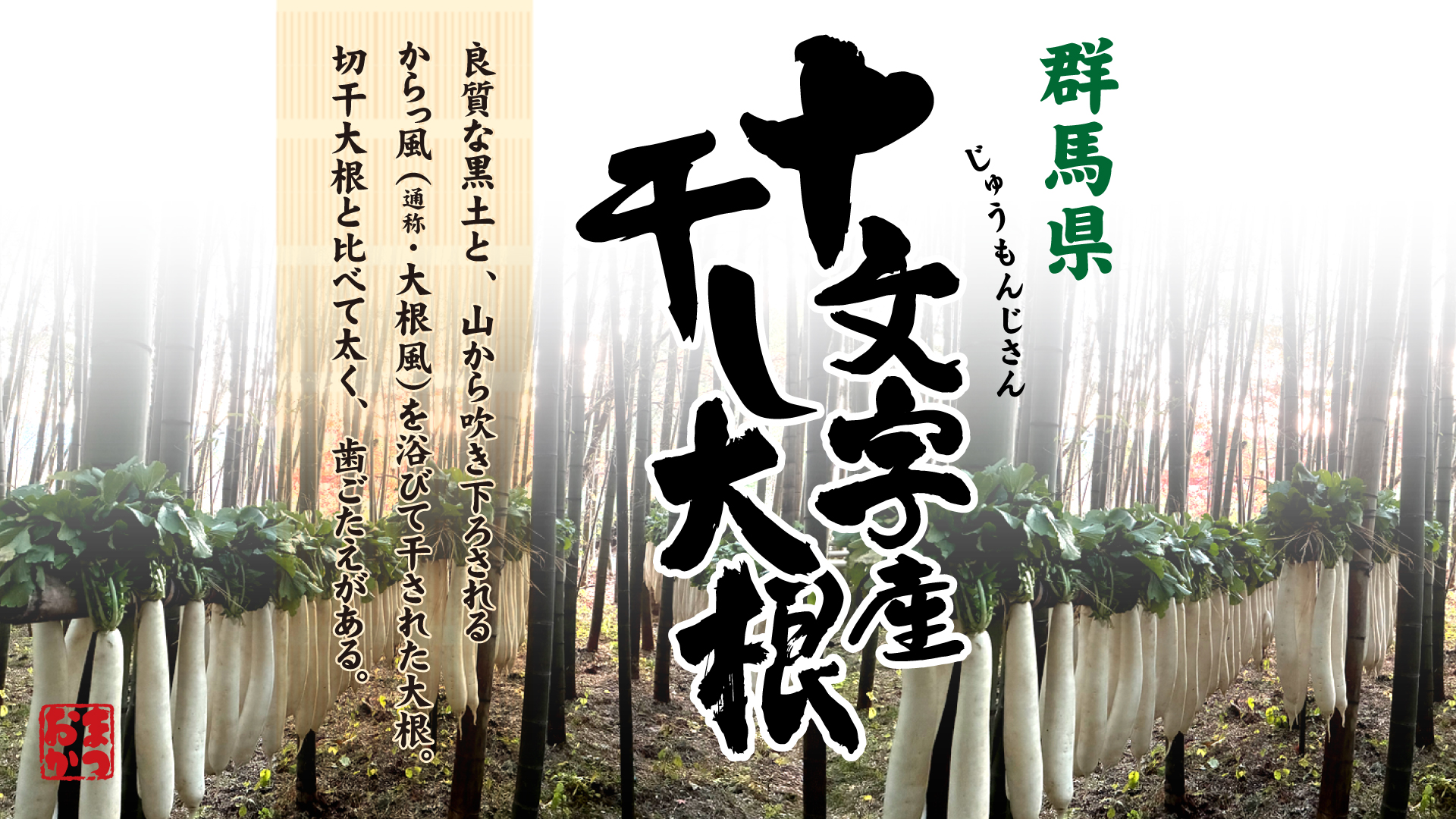十文字大根とは、群馬県高崎市の十文字地区で栽培された大根で、たくわんを漬ける用の干し大根として多く消費されています。